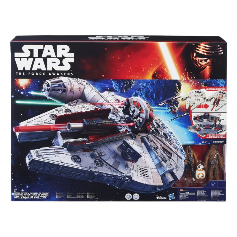 - Véhicule pour figurines Star Wars 10 cm, avec nombreuses parties mobiles et effets sonores et lumineux électroniques. Le Millenium Falcon s'ouvre pour se transformer en playset pour vos figurines, avec un blaster NERF ELITE! Livré avec figurines Chewbacca, Finn et BB-8.